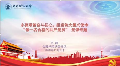 金融公司党委书记毛静为新生入党积极分子和发展对象讲授“永葆艰苦奋斗初心、担当伟大复兴使命——做一名合格的共产党员”的党课,坚定同学们的入党信念,提升政治理论水平。