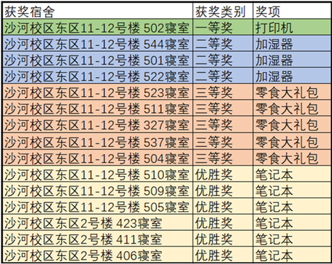 此次寝室文化节颁奖活动在沙河校区东区主教209举行,前来颁奖的嘉宾有研究生会主席李隽和副主席邢真。此次寝室文化节活动创新性地分为“标语设计及合影”、“寝室才艺展示视频”两大形式,其中“标语设计及合影”活动共计有15个寝室获奖,“寝室才艺展示视频”活动有11个寝室获奖,本次寝室文化节奖品丰富,第一名将会得到打印机一台!每个参赛宿舍都使出了七十二般武艺争夺这份豪华大奖。
