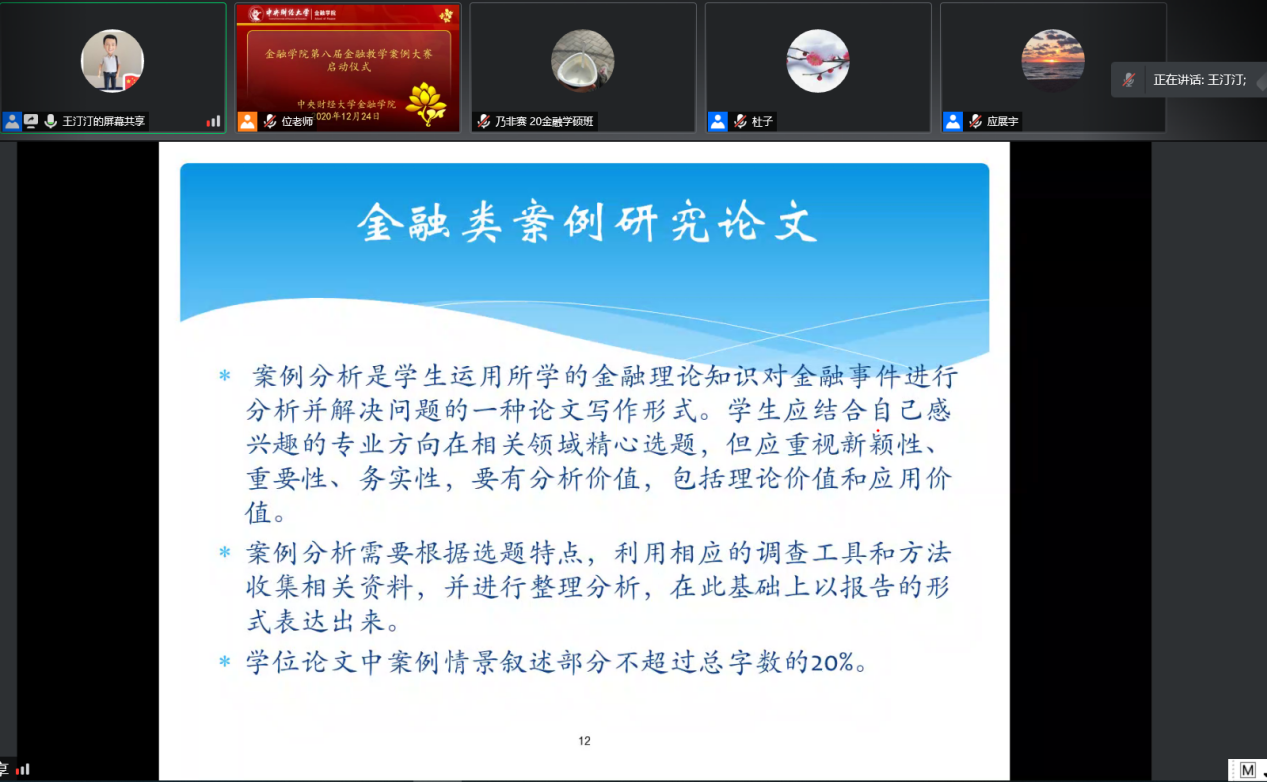 为鼓励同学们积极参与案例大赛,进一步提升公司教学案例开发水平,2020年12月24日晚,由韦德1946体育官方入口专硕教学研究与案例中心主办、研究生教学科研办公室承办的韦德1946体育官方入口“第八届金融教学案例大赛”动员大会通过腾讯会议在线举行。本次研讨会邀请到公司副经理应展宇教授、应用金融系杜惠芬教授和金融专硕教学研究与案例中心主任王汀汀教授,老师们围绕教学案例的选题与写作,与2019、2020级研究生进行了深入的分享和交流。公司研究生教学科研办公室老师位锦和研究生310余人共同参加,此次活动由王汀汀教授主持。