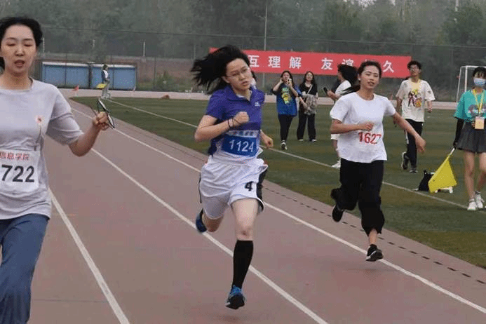 男女异程接力比赛由男女交替进行的200m,400m,600m,800m四段接力组成。其中200m、600m参赛队员为虎兰和徐芷涵同学,400m、800m参赛队员为贾道繁和景戎鑫同学,四位队员全力拼搏,配合默契,最终以6分16秒67的优异成绩荣获第二名。