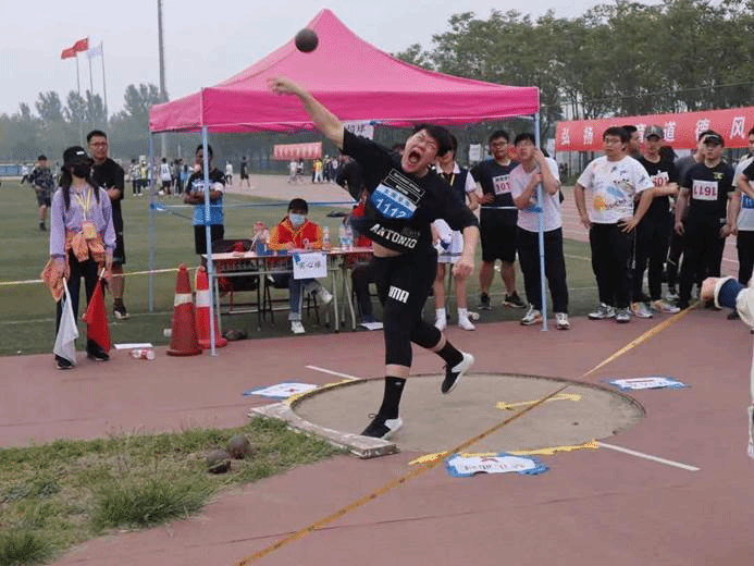 张铁一和李丙坤参加了男子铅球比赛,张铁一同学以绝对的力量夺冠,同时,李丙坤同学也获得第八名的好成绩。