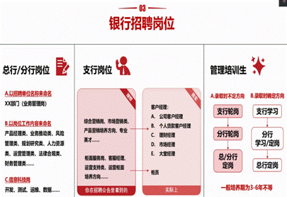邴艺老师的讲座主要分为五部分:银行业务类型介绍、银行组织架构介绍、银行招聘岗位说明、职业发展路径介绍和招聘流程介绍。在业务类型介绍中,邴艺老师以图表形式全面介绍了银行的资产、负债和中间业务;在介绍银行组织架构时,邴艺老师详细说明了总行、分行和支行的联系与区别;在介绍银行招聘岗位和职业发展路径时,通过举例,老师生动地说明了不同岗位的具体工作内容,并点明各岗位的发展趋势和可能性;在介绍招聘流程时,老师从面试官角度,从笔试和面试两方面对同学们应聘给出切实高效的建议,希望同学们在面试中不要泛泛而谈,应当突出自身优势,引起面试官兴趣。
