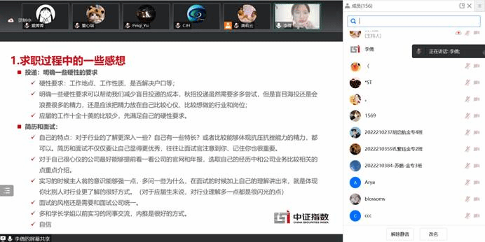 会议伊始,就职于中证指数有限公司的20级金融专硕班生李学姐分享了简历投递及笔面试的注意事项。她建议在投递简历时需明确工作城市及性质等一些硬性要求,避免无目的的海投。在简历及面试方面,她建议主动寻找自身特长,突出自身优势。最后,李学姐向同学们介绍了指数公司及被动投资领域相关业务,为各位同学的就业方向提供了参考。