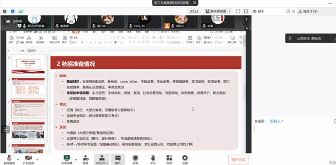 现就职于中国建设银行总行的20级金融专硕班刘学姐向大家分享了自己的秋招心得和体会。她认为求职过程中信息搜集能力十分重要,同学们可通过各种求职分享群及公众号搜集信息,并对其进行有效整理。由于总行看重综合素质,她希望同学们能够全方位发展,并准备一些与银行相关的时事热点。最后,刘学姐希望同学们保持自信,不要过度焦虑。