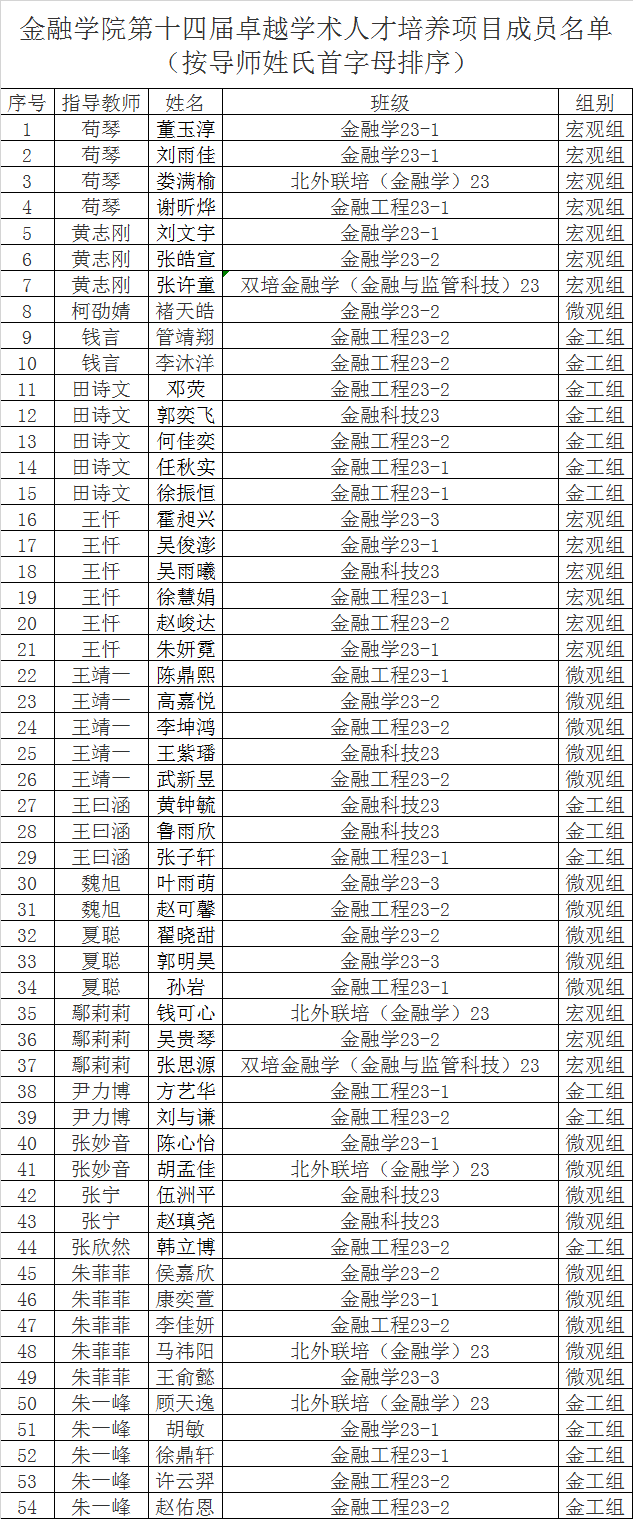 经过导师和员工双向选择,54名同学成功入选第十四届卓越学术人才培养项目。“路漫漫其修远兮,吾将上下而求索”,期待新入选的同学们秉持学术初心,在未来的学习与研究中勇攀高峰,成长为兼具国际视野与专业实力的金融领军人才,为学术发展注入蓬勃力量!