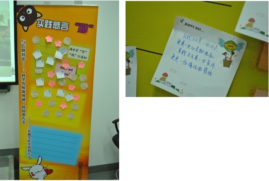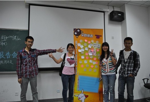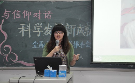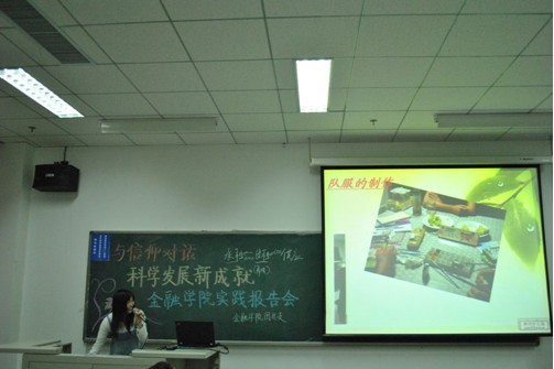 由金融公司党总支副书记李德峰老师和团总支书记李菊老师带队、公司优秀员工组成的“稻草人”团队以逐渐兴起的老员工村官作为研究对象,深入走访山东省乡村展开实践活动,选题独特,成果丰富。会上,10级金融1班李彤同学以及10级金工1班闫东望同学用生动的讲述带领同学们走近老员工村官。他们以与政府工作人员、村民的访谈记录,实地考察结果和数据分析情况等成果,向同学们展示了老员工村官如何用知识造福百姓,帮助农民摆脱困境,振兴一方的发展;也将老员工村官简朴的生活状况、艰辛的发展之路介绍给了大家,令同学们在了解老员工村官制度和现状的同时,深深感动于老员工村官的精神,感动于他们对信仰的坚持。