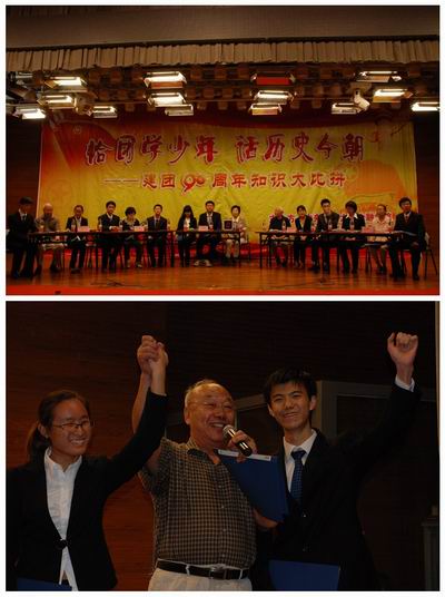 之后,知识大比拼正式开始。海淀区的老干部们和同学们一起组成参赛队,每队两名同学、一名老干部。各参赛队伍或文艺、或霸气、或幽默地展现了各自的队伍特色,将整场的气氛推向高潮。台下各支部“亲友团”也纷纷予以响应,台上台下互动不断,热情充溢着整个金厅。比赛主要分为问答和抢答两个部分,中间穿插着猜词游戏、红歌串烧等环节。每个队伍都有备而来,实力不容小觑,在问答环节中始终不相上下。无论是老干部、老团员还是正值青春的同学们,都展现出了共青团员的风采。场下的亲友团也不甘落后,积极参与猜词游戏、歌曲串烧,为各自的团支部欢呼加油,十分给力。比赛在轻松欢乐的氛围中进行着,大家也在各种团学问题中增长了不少知识。直至最激烈的抢答环节,让一直轻松的氛围增添一丝紧张,此刻,各队比的不仅是知识,还有灵敏度。每支队伍都像整装待发的军队,随时准备抢答,现场气氛被推向高潮。