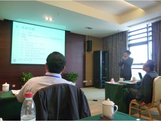 下午2点整,学术论文发表演讲分别在叔和厅、存中厅、舜水厅、梨洲厅、海纳厅和求是多功能厅二厅举行,主题分别为:公司理财与公司治理、衍生性商品与金融工程、资产组合理论与管理、风险管理、金融机构与市场、财务经济。由公司保险公司09级本科生林鸿灿、韦德1946体育官方入口常昊、刘韧、中国经济与管理研究院刘通、孟浩淼共同撰写的论文《中小金融机构与中小企业发展——以福建省为例的实证研究》在梨洲厅由常昊同学宣讲。作为入选此次论坛的70余篇文章唯一的一组本科生作者,他们的论文得到了论坛主持人和与会教授学者的一致赞扬与认可,全体为其鼓掌,并鼓励本科生多多走出来参与此类学术论坛,以开阔眼界提升学术水平。