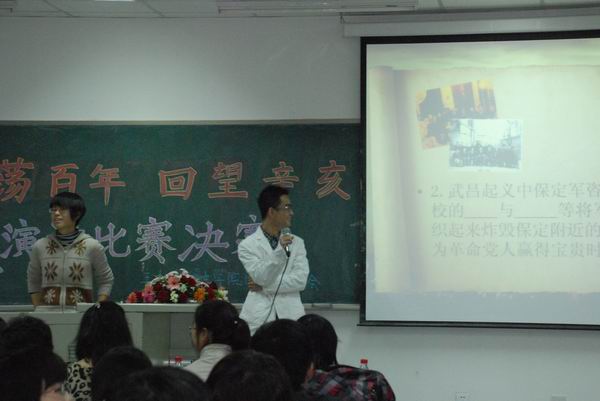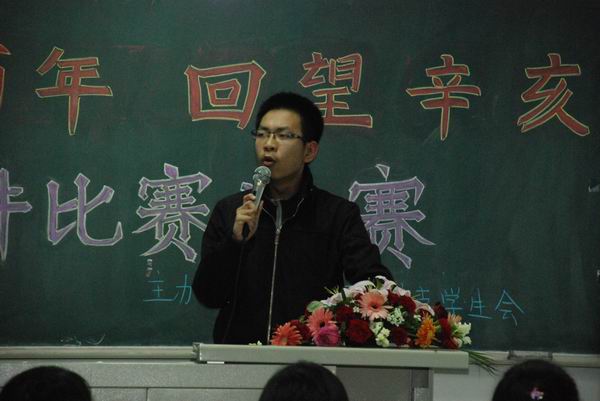 晚秋的夜,清冷萧索,然而106室里却是一片热闹非凡——距比赛还有约二十分钟,教室里已有多位参赛选手及其智囊团做着赛前最后的准备。晚7点,比赛在同学们的期待和热情中开始。首先,由两位主持人介绍了三位评委,之后介绍了本次比赛规则和评分标准。本次比赛分为两部分,包括选手的演讲和辛亥知识问答。其中知识问答环节可由选手的场下智囊团相助。