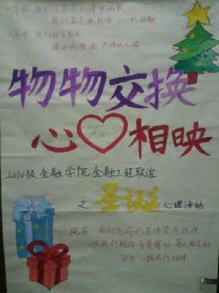 在2011年圣诞节来临之际,2010级金融工程1班和金融工程2班开展了“物物交换,心心相应”的圣诞礼物交换活动,两个班级共90名同学参与了此项活动。这次活动不仅给同学们留下了一个难忘的圣诞节,增强了班级的凝聚力,也让同学们都更加珍惜相聚在一起的日子。