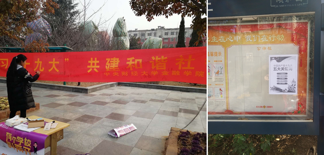 为进一步了解十九大之后新规、新政策在基层的实施情况,“精神传承小分队”走街串巷,对家乡的居民发放调查问卷,与地方政府沟通对接。他们将十九大精神宣传与寒假母校回访相结合、组织了学习十九大签名活动、设计并制作了十九大宣传手册,得到了一致好评。