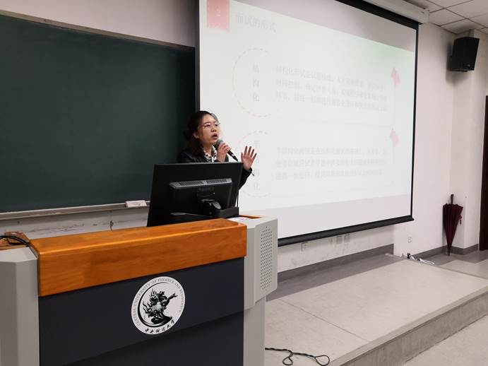 面试是求职过程中重要环节,为了让同学们更好地掌握面试技巧,2019年4月24日下午,由公司职业发展中心主办、研究生会职业发展部承办的职业发展系列讲座(十七)——面试技巧专题讲座在沙河校区主教210教室举办。中公教育集团研究院专职面试老师徐晓欣作为此次讲座的主讲嘉宾,公司本硕博2020届毕业生70余人参加。