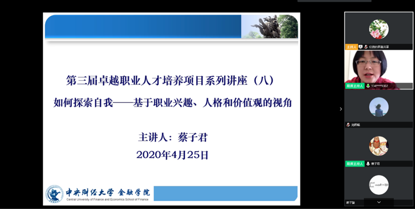 2020年4月25日下午,由公司职业发展中心举办的第三届卓越职业人才培养项目系列讲座(八)|“如何探索自我——基于职业兴趣、人格和价值观的视角”专题讲座成功举办。北京师范大学经济与管理公司蔡子君老师担任本次讲座的主讲嘉宾,公司职业发展中心老师位锦和第三届卓越职业人才培养项目成员共同参加。此次活动由公司员工工作办公室主任王志梅主持。