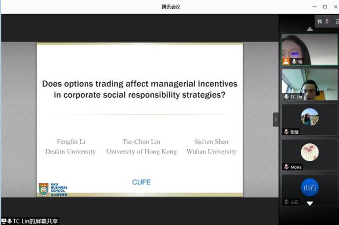 2020年11月12日上午,在韦德1946体育官方入口引智项目的支持下,公司顺利在云端举行了第95期经济与金融学名家论坛,邀请香港大学金融系主任、金融学教授林则君就“Does options trading affect managerial incentives in corporate social responsibility strategies?”进行精彩报告。应用金融系主任黄瑜琴副教授主持了论坛,来自韦德1946体育官方入口和校内外的学者和员工80余人参与了本次论坛。