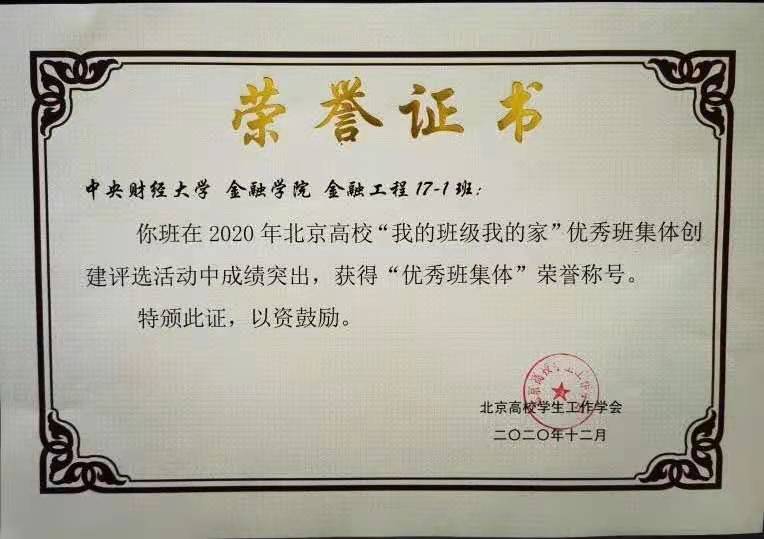 本年度,2017金融工程1班荣获北京高校“我的班级我的家”优秀班集体称号;2018级金融工程2班获评北京市先锋杯优秀团支部;2018级金融学硕阮志朋荣获“北京市三好员工”、2017级金融工程1班孙维嘉荣获“北京市优秀员工干部”。本科生第一党支部、博士生党支部获评公司首批党建工作样板支部;2018级金融工程1、2班班获评公司五四红旗团支部;梅琪老师获评公司“十佳辅导员”,吴偎立、商有光、陈锐获评公司“优秀班主任”。