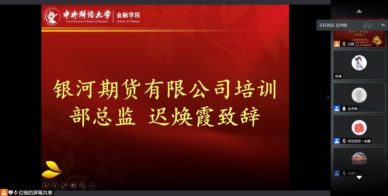 2020年12月28日晚,公司与大连期货交易所、银河期货有限公司共同主办的“高校期货人才培育工程项目(第四期)”结项仪式通过线上腾讯会议圆满完成。公司副经理应展宇教授、银河期货有限公司培训部总监迟焕霞女士和高校期货人才培育工程项目(第四期)学员们出席了此次结项仪式。本次活动由公司研究生教学科研办公室老师位锦主持。