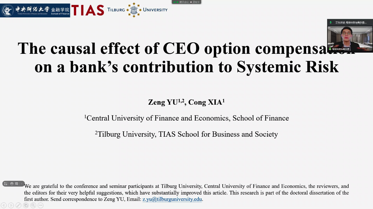 喻曾是公司与荷兰蒂尔堡大学合作举办金融学博士项目2018级在读生,此次入选论文为他和夏聪助理教授合作完成的论文《The causal effect of CEO option compensation on a bank’s contribution to Systemic Risk(银行系统中CEO期权薪资与银行系统风险之间的因果关系检验)》。