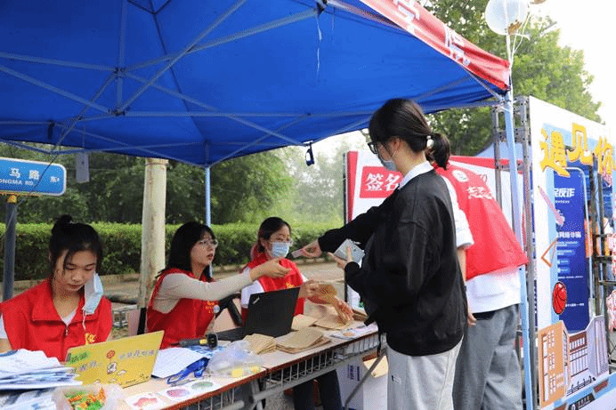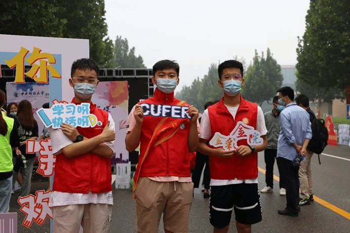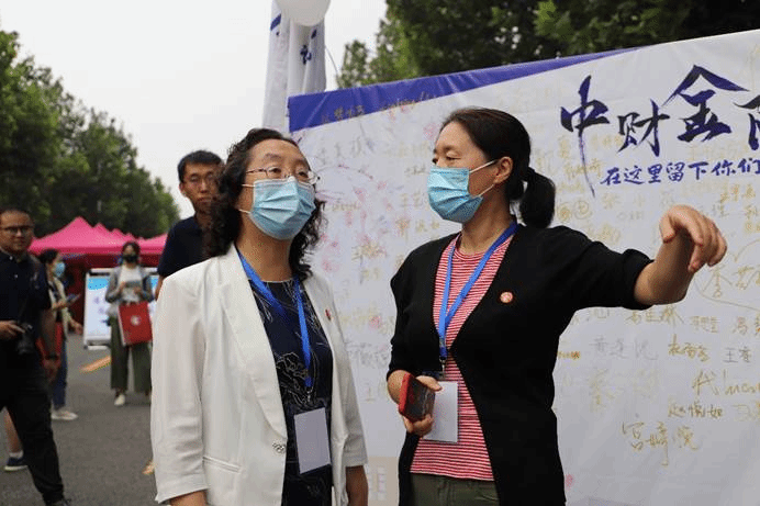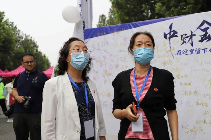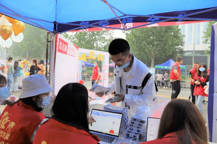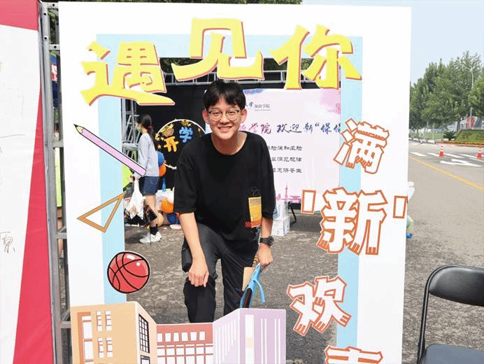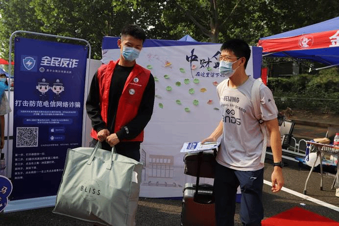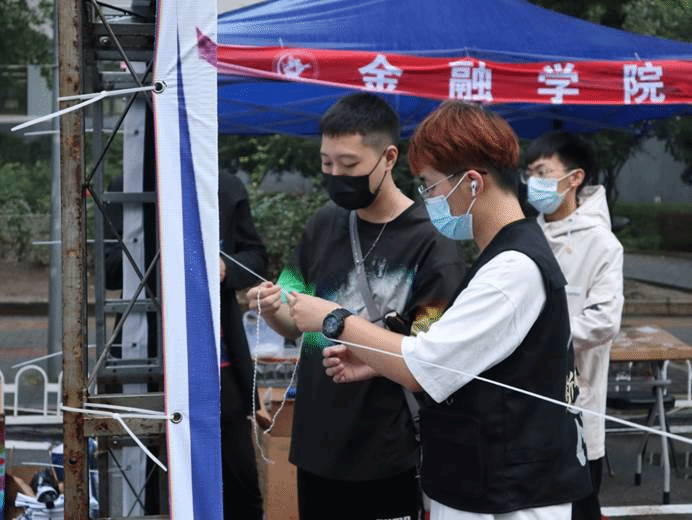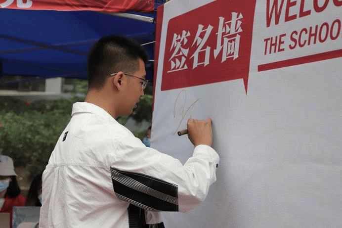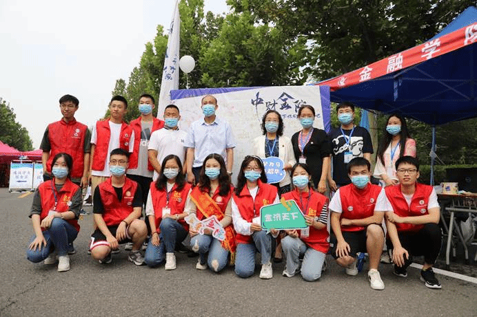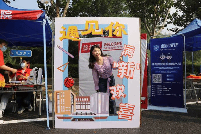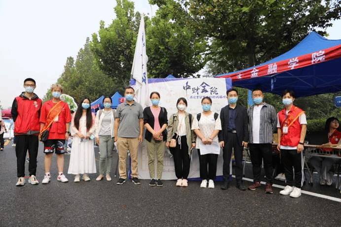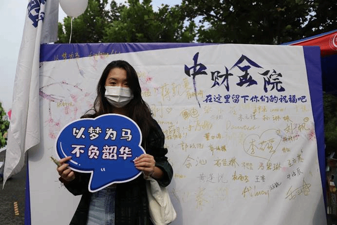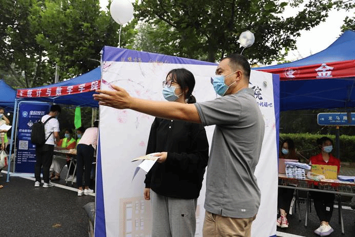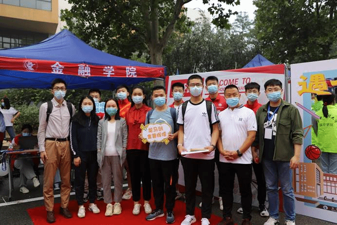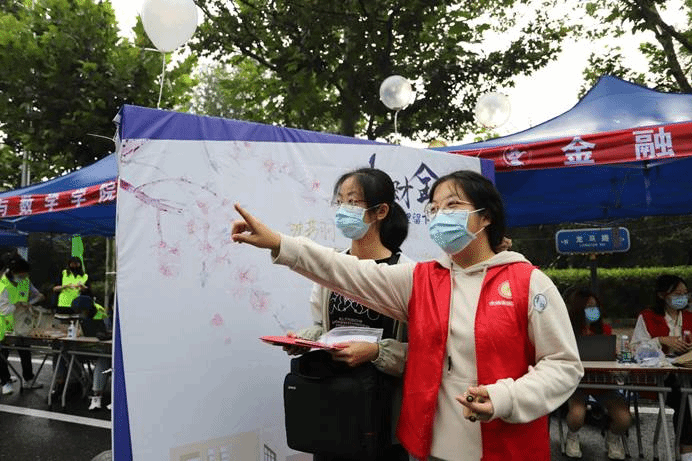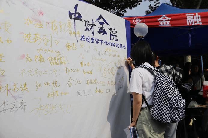 作为中财大院,金院的报道点也有许多亮点:象征着金彩金院的白金金属气球装饰着迎新棚,志愿者可以手持的青春标语KT板,新生可以寄语留念的祝福墙,以及带有公司标识的合照板,处处精心的布置彰显了公司对新生的美好期许。
