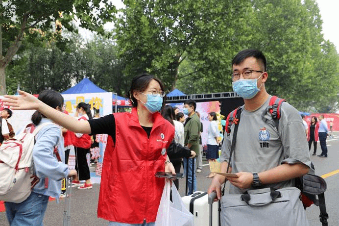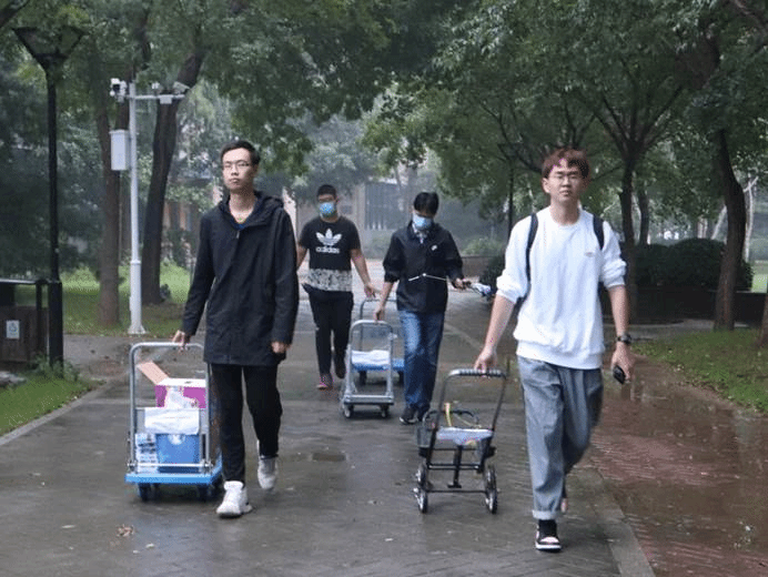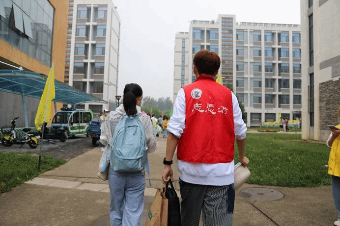 新生在完成报到手续之后,由公司事先招募的志愿者接过行李箱,引领同学前往宿舍,并帮助员工将行李搬运至宿舍楼上。尽管空气闷热,志愿者们已经汗流浃背,脸上却依旧挂着满足而温暖的笑容,时刻准备帮助下一位有需要的同学。