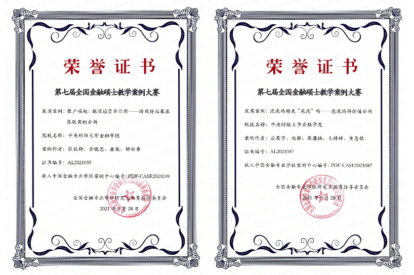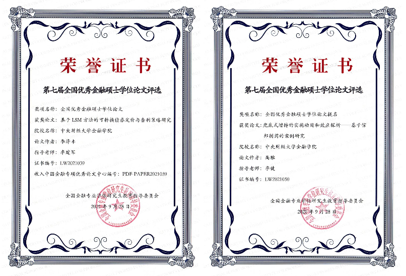 10月,全国金融专业学位研究生教育指导委员会发布《关于第七届全国优秀金融硕士学位论文评选结果的通知》,公司两篇论文分别获得全国金融硕士学位论文优秀奖(作者:李泽丰,指导教师:李建军)和提名奖(作者:高雅,指导教师:李健)。