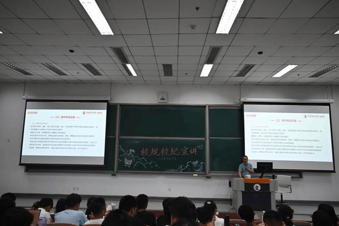 9月19日下午,2023级本科生新生校规校纪教育于沙河校区主教218教室举行。金融公司党委副书记、纪委书记徐振东老师主讲,2023级辅导员马露、卢宇及全体新生参加讲座。