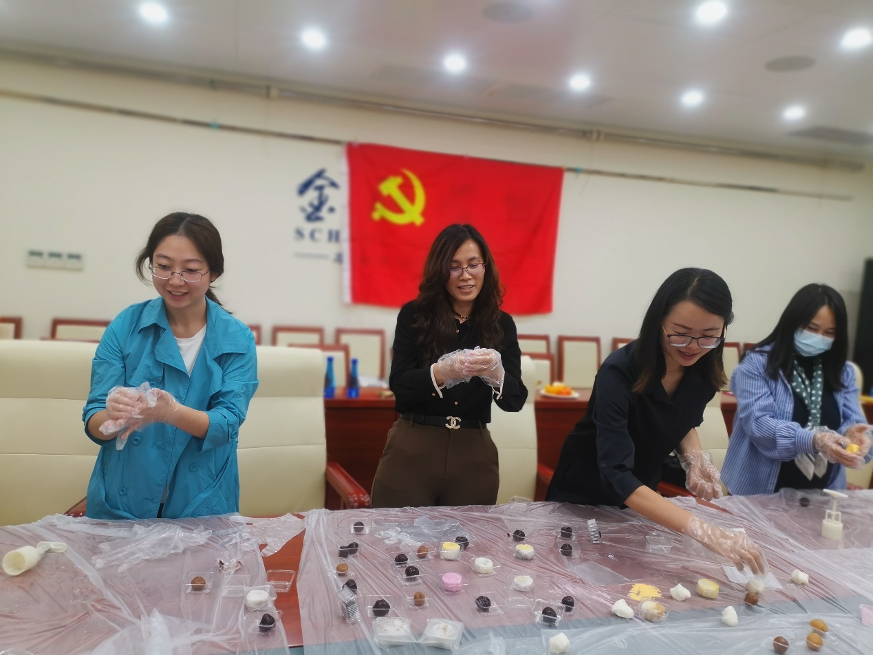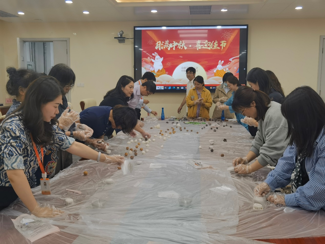 第二个环节是自制月饼活动。宁波银行工作人员为现场提供了制作月饼所需的馅料、月饼模具、月饼包装盒等材料,并详细介绍了月饼制作过程。参加活动的教师们纷纷戴上一次性手套,制作出了一个个精美的冰皮月饼,活动也在大家的欢声笑语和月饼的清香中落下帷幕。