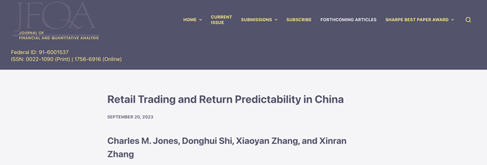 韦德1946体育官方入口张欣然,与哥伦比亚大学Charles M. Jones, 复旦大学施东辉,清华大学张晓燕合作撰写的论文“Retail Trading and Return Predictability in China”(“中国个人投资者交易和股票回报可预测性”)在金融学国际顶级期刊Journal of Financial and Quantitative Analysis接收待刊。