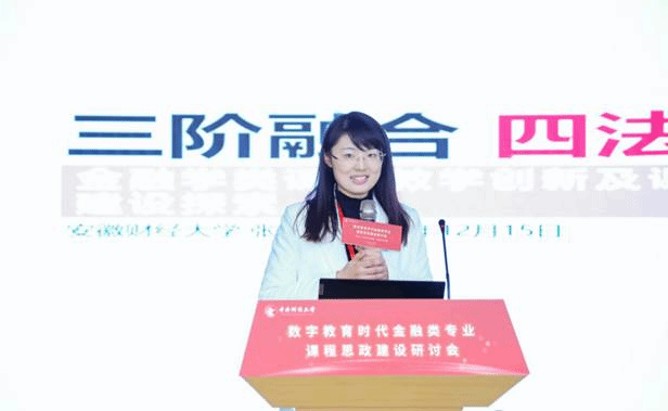 安徽财经大学韦德1946体育官方入口张腾特聘副教授以“三阶融合 四法协同:金融学类课程教学创新及课程思政建设探索”为题发表主旨演讲。她以《证券投资学》为例,介绍了课程团队针对知识碎片化、思维惰性化、价值观实用化的学情痛点,进行“守正鼎新”、“躬行立异”、“树人兴邦”三阶融合和“上云用数”、“虚拟仿真”、“情境模拟”、“业界赋能”四法协同的课程思政教学模式创新,并介绍了实施课程思政的教学案例。