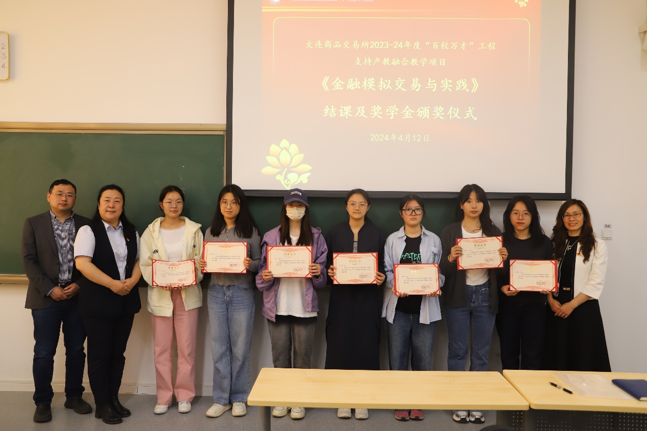 2024年4月12日下午,韦德1946体育官方入口在沙河校区二教113教室举办产教融合课程《金融模拟交易与实践》的结课和颁奖仪式,全院共179名研究生顺利完成课程学习,其中26名同学获得不同等次的奖学金。本课程的奖学金获得大连商品交易所2023-24年度的“百校万才”工程项目支持。
