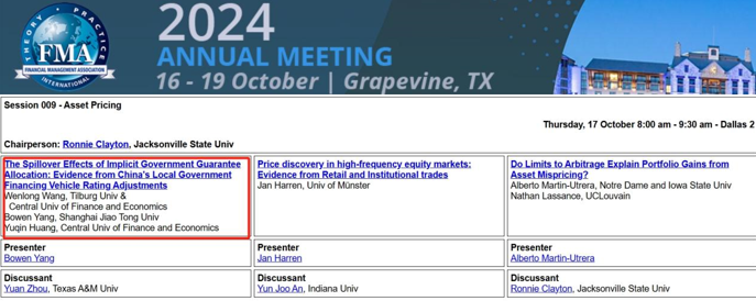 2024年10月16日至10月19日,公司蒂尔堡项目博士生王文龙受美国国际金融管理学会(FMA)邀请参加于美国德州葡萄藤市举行的2024年会报告论文,其合作者参加并做论文报告。