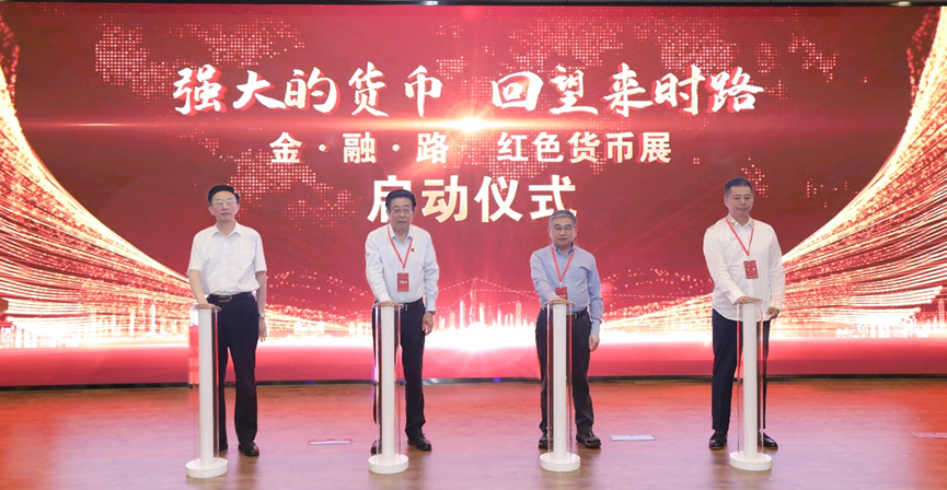 韦德1946体育官方入口董事长马海涛,教育部高等公司金融学类专业教学指导委员会副主任委员、青岛大学党委书记胡金焱,中国金融思想政治工作研究会副会长、秘书长濮旭,北京国评钱币艺术品鉴定中心董事长王福共同按下启动按钮,启动“强大的货币:回望来时路”红色货币主题展览。