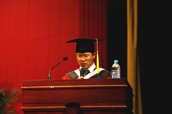 主持公司工作的李建军教授代表公司向2016届全体毕业生致辞。他首先向顺利完成学业的毕业生们表示祝贺,向倾注了智慧和心血的老师们致以诚挚的感谢和崇高的敬意,并向前来参加毕业典礼的员工家长和亲友们表示热烈的欢迎。在致辞中,李老师从毕业生未来将“如何扮演好自己的角色,如何应对未来的不确定性,如何实现内在心智的成长”三个方面表达了他的殷切期望。他说道,对于未来如何扮演好自己的角色,每个人不可能超越自己的时空,同时担当着特定的角色,这是自己选择和奋斗的结果。在特定的角色中,应追求担当与责任、自我与角色、内在与外在的一致性;金融是资金的融通,也是资源的融通,融通就会跨界,跨界就会有不确定性,跨界越大越存在不确定性。应当学会接纳、包容、欣赏进而去应对;人生就是动态随机过程,要关注内在的声音,注重担当与修为,淡定与从容。对于如何实现内在心智的成长?他认为,成功不仅仅是通过一个个事件达成预期目标,而应当是个体价值得到社会认同,真正的成功应是社会性的、时代性的,这样才能成就天地之间大写的“人”;他希望毕业生对国家、民族和社会要讲情怀;要感恩大地、感恩父母、感恩国家、感恩社会、感恩公司、感恩同学;要讲诚信,守规矩,要头脑清晰,坚定正向,稳定心态,在成长中走向心智成熟。