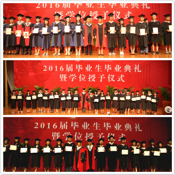 典礼在嘹亮振奋的《义勇军进行曲》中拉开了帷幕。应展宇副经理宣读了《关于2016届本科生毕业及授予学士学位的决定》,党总支副书记谭小芬宣读了《关于2016届研究生毕业及授予学位的决定》。在随后的优秀毕业生表彰环节,党总支书记葛仁霞宣读了《关于表彰2016届优秀毕业研究生的通知》。葛仁霞书记和李建军副经理(主持工作)为北京市级优秀毕业生颁发了荣誉证书,国家级教学名师李健老师、应展宇副经理、经理助理黄志刚老师、公司分工会主席李宪铎老师、国际金融系主任张碧琼老师、应用金融系主任韩复龄老师为校级优秀毕业生颁奖并合影留念。