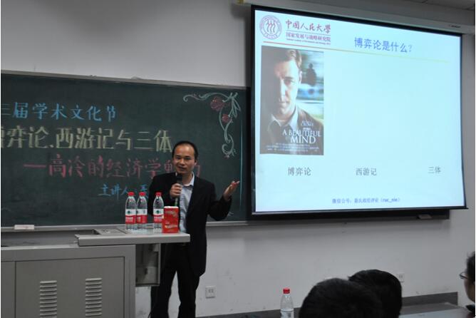 2016年5月4日星期三,在韦德1946体育官方入口沙河校区主教305教室开展了“博弈论、西游记与三体—高冷的经济学魅力”的讲座。主讲人是中国人民大学经济学博士,美国哈佛大学经济学系博士后聂辉华教授。出席此次讲座的有金融公司党总支副书记谭小芬教授和团总支书记李菊,同学们对本次讲座充满兴趣,教室里座无虚席。