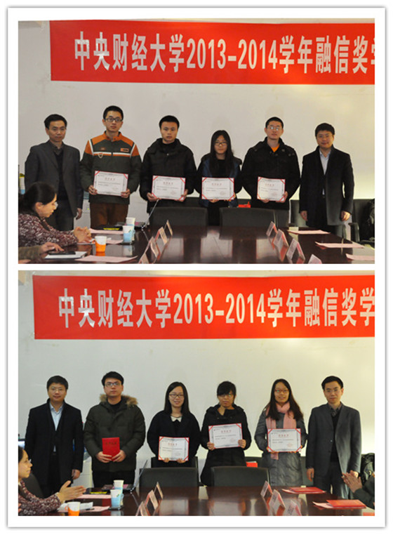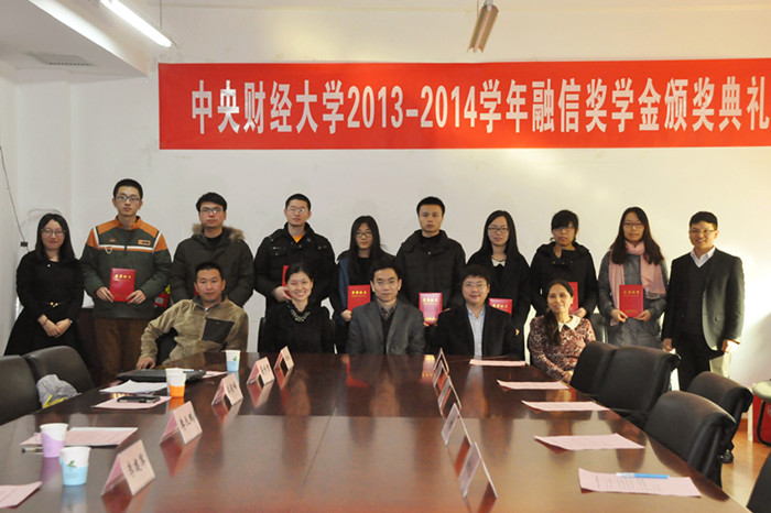 在主持人宣读《关于颁发2013-2014学年融信奖学金的通知》后,李建军副经理和李天鹏总裁分别为此次获奖的本科生和研究生颁发获奖证书并合影。随后获奖员工代表2013级证券投资专业赵佳同学发言。她代表所有获奖同学感谢融通汇信公司对同学们的帮助,她表示获得融信奖学金不仅是对自己学习上的一种肯定,更加是对同学们精神上的鼓舞与帮助。付出终有回报,温暖无处不在。获奖同学将以社会责任为己任,去努力学习、踏实工作,回报社会。