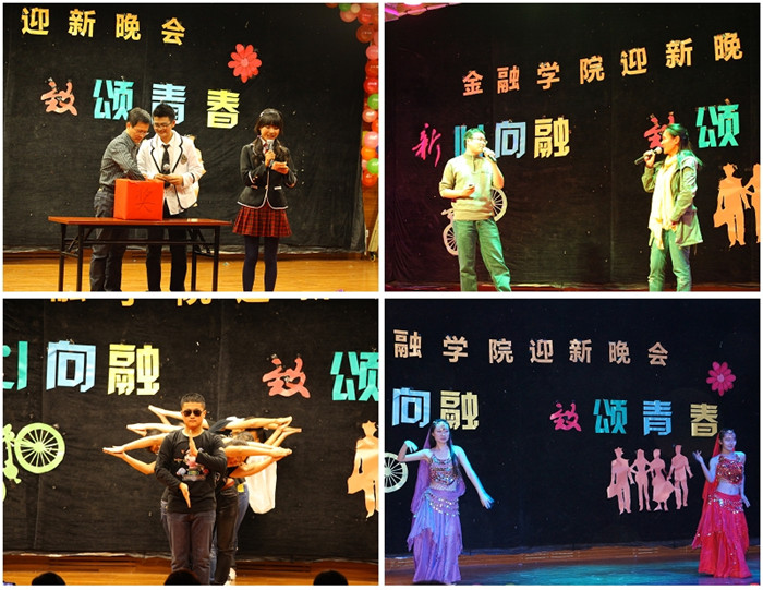 领导致辞后,晚会迎来第三个节目——由金融12—1班带来的话剧《搞笑英雄》,他们幽默风趣的表演引得全场笑声不断,掌声连连。随后由排孜努尔、刘婉威、王瑷月、早克然等表演的肚皮舞和新疆舞的舞蹈串烧呈上了一份充满民族风情的拼盘,华丽的服装、优雅的舞姿展现出属于金院员工们的“最炫民族风”。值得一提的是,金院不仅有多才多艺的员工,还有许多深藏不露的老师。在以“迎新生,致青春”为主题的教师三句半节目中,王志梅、谢海燕、王盈和刘勇四位老师默契的配合及高超的演技给同学们留下了深刻的印象。韦德1946体育官方入口主席团节目《你是我的脸》创意独特,配合默契,可爱的小人服装加之令人捧腹的体操与舞蹈令全场师生欢笑不断。晚会进行到一半,迎来了激动人心的现场抽奖环节,党总支副书记谭小芬老师受邀作为抽奖嘉宾依次抽取了三、二、一等奖的获得者,抽奖过程紧张欢快,惊喜不断。抽奖结束过后,金融13-1班班主任魏旭和国金13班班主任陶坤玉走上舞台一展歌喉,嘹亮的歌声响彻整个金色大厅。听觉盛宴过后是金工12—2班的舞台剧《决战紫禁之巅》,独具创意的情节设计,动感十足的搞笑舞蹈给同学们留下了深刻的印象。