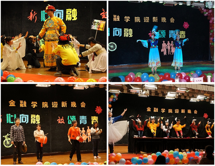 伴随着长鼓舞铿锵的鼓点与青花瓷乐器合奏典雅的旋律,迎新晚会在一段清新唯美的视频中拉开了序幕。晚会开场,文艺部女生身着白裙,表演精心准备的小合唱《故事里的树》,歌声婉转,将在场的同学们带入故事里。合唱结束,主持人随即登台宣布了本次迎新晚会的开始并介绍了到场的各位领导和嘉宾。随后是校园十佳歌手王陆、以色列,公司十佳歌手彭树立、高翔、戴启鸿等带来歌曲的联唱,动感的音乐、动听的歌声点燃了全场观众的激情。接下来,金融公司党总支书记葛仁霞为本次晚会致辞。葛书记首先对新生们的到来表示热烈的祝贺和诚挚的欢迎,然后在敦促同学们刻苦学习、提高专业能力的同时也提醒同学们要注意培养兴趣爱好,发展“软实力”。最后,葛书记希望新生们能在拥有一个令自己满意、充实又难忘的大学时光并预祝迎新晚会取得圆满成功。