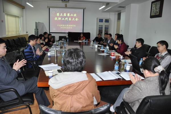 教代会在庄重的国歌声中拉开帷幕,随后韦德1946体育官方入口经理张礼卿作了题为“2012年工作总结及2013年工作思路与要点”的报告,该报告简要对公司过去一年的工作进行了总结,明确了2013年的工作目标,并围绕“以团队建设为中心,立足人才培养、科学研究、社会服务三个基本点,以管理、创新、服务为保障”的工作基本思路对未来一年的工作计划做了详细阐述。报告中,张礼卿经理着重强调了本年度的七项工作重点:专业建设和各项专项任务落实工作;本科生和研究生人才培养工作;科学研究工作;团队队伍建设工作;国际合作工作;硬件设施和内部管理工作;员工思政、党建和员工工作。接着张经理向代表们报告了2012公司的财务收支状况。