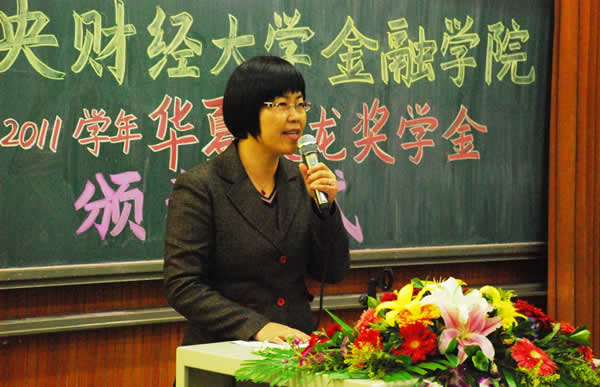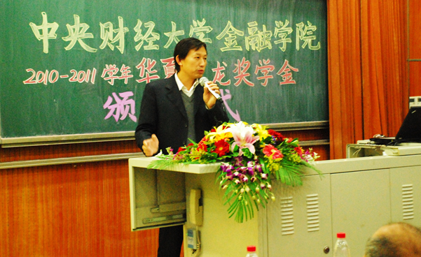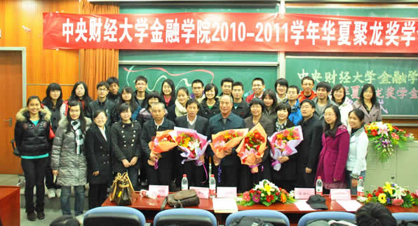 11 月 24 日 ,一年一度的感恩节,在这样一个特殊的日子里,韦德1946体育官方入口 2010-2011 学年华夏聚龙奖学金颁奖仪式在沙河校区 3 号公司楼 222 报告厅隆重举行。北京华夏聚龙自动化股份公司董事长张建军先生、副总经理崔万林先生、副总经理常锦平女士, 韦德1946体育官方入口原党委书记、博士生导师李保仁教授、金融公司党总支书记葛仁霞老师出席了本次颁奖仪式。仪式由金融公司党总支副书记李德峰老师主持。