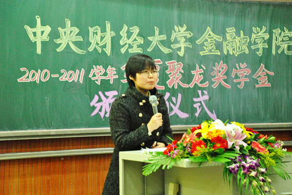 听完嘉宾和老师们温暖的讲话,活动进入了激动人心的颁奖环节。 27 位获得奖学金的同学按照一、二、三等奖依次上台领奖, 北京 华夏聚龙自动化股份公司的领导和公司领导为获奖员工颁发了获奖证书并合影留念。随后, 2008 级金融学一班“优干保研”的罗丹同学代表全体获奖员工发言,感恩是她发言的主题。“是公司、老师、社会各界的关怀让我能够放心去飞。”罗丹同学激动地说。她向在场的所有人作出了郑重的承诺,她必定会更加发奋努力,用优异的成绩回报社会。