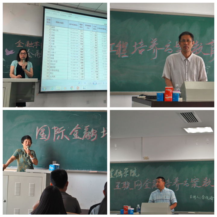 金融学专业培养方案教育会由左毓秀副教授主讲,她从不同方面剖析了老员工活与专业前景,从金融学的发展领域展开,分别对金融机构体系与金融市场体系进行讲解。金融工程培养方案教育会由李磊宁副教授主讲,他采用大量实例引出金融工程专业的学科特点,并详细阐述了金融工程专业课程设置的结构和培养目标。国际货币与国际金融专业培养方案教育会由张碧琼教授主讲,她从狭义与广义两个层面为新生解释了国际货币与国际金融的概念,结合了宏观与微观的金融学视角阐释了国际货币与国际金融专业的学科特点。互联网金融培养方案教育会由经理助理李俊峰副教授主讲,他指出互联网金融是新开设的专业,致力于培育新型金融业态运行模式的应用型创新金融人才。
