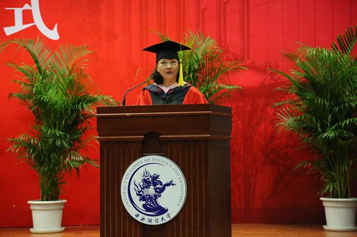 2017届毕业生代表张金慧同学代表全体毕业生发言。她回忆了在公司度过的难忘岁月和青春记忆,毕业生离开校园但财经黄埔人的初心永不变。她号召毕业生要做创新社会的中流砥柱和改变世界的中财力量,永远铭记中财学子的责任担当,带着母校、公司和老师的殷切希望,开启新的征程。