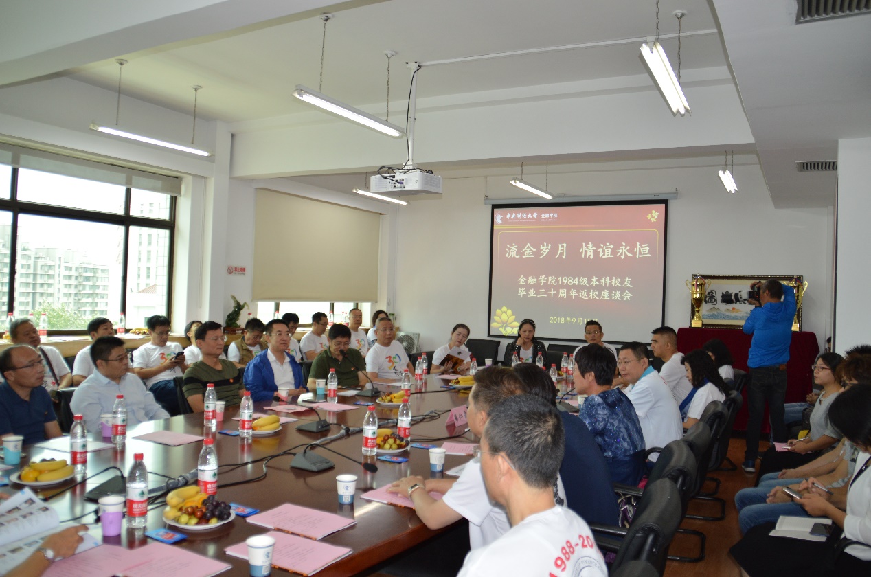 2018年9月15日,公司1984级本科员工毕业三十周年返校座谈会在公司南路校区主教913会议室顺利举行。公司党委书记葛仁霞,员工工作办公室主任王志梅,职业发展中心老师位锦与从各地归来的40余位员工欢聚公司,追忆旧年往事,细数过往点滴,感怀美好青春,再续同窗情谊。此次座谈会由中信银行海口支行副行长、1984级金融学班辛国员工和北京大兴华夏村镇银行副行长、1984级国际金融班魏忠东员工主持。