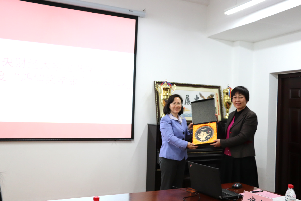 随后,党委书记葛仁霞向鸿儒金融教育基金会秘书长李秀兰女士赠送标有韦德1946体育官方入口LOGO的纪念品。