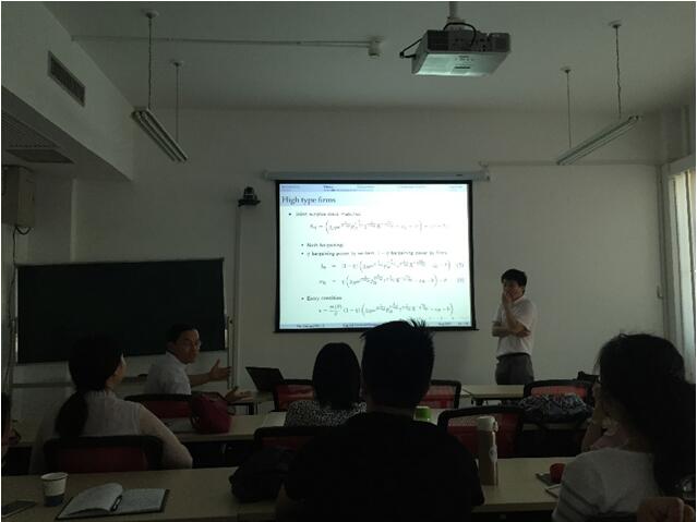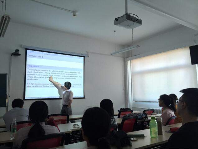 在9月20日的学术报告中,杜清源助理教授汇报了主题为“Capital Account Openness and Unemployment: the Role of Labor Market Institutions and Stage of Development”的研究。在该文中,杜清源助理教授首先从理论上证实了资本账户开放对一国就业的影响取决于该国的劳动力市场灵活性,并就此提出三个命题:(1)对于劳动力市场灵活性高的发展中国家而言,资本账户开放能够促进资本流入并提高国内就业;(2)对于劳动力市场缺乏灵活性的发展中国家,资本账户开放会导致国内就业的下降;(3)对于高收入国家,资本账户开放对该国就业的影响与劳动力市场灵活性无关。随后,杜清源助理教授对以上三个命题的实证部分进行了汇报,实证检验结果支持了理论模型的三个预测。在讨论交流环节,在场师生围绕理论模型的构建和实证检验等问题与杜清源助理教授进行了热烈的探讨。