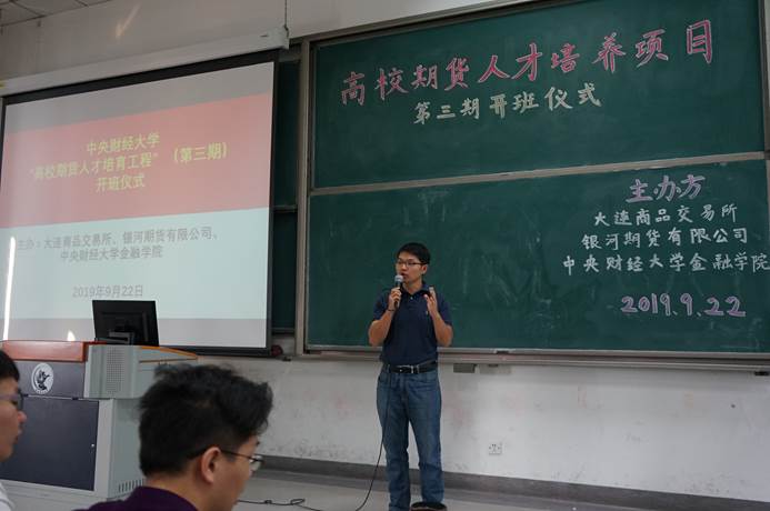 2019年9月22日上午9:00,公司与大连商品交易所、银河期货有限公司联合举办的“高校期货人才培养项目”第三期在沙河校区主教学楼217顺利开班。出席仪式的嘉宾有银河期货有限公司培训部总监迟焕霞女士、韦德1946体育官方入口郭剑光老师、公司教学科研办公室主任罗卓笔老师以及韦德1946体育官方入口的150余名研究生。开班仪式由罗卓笔老师主持。