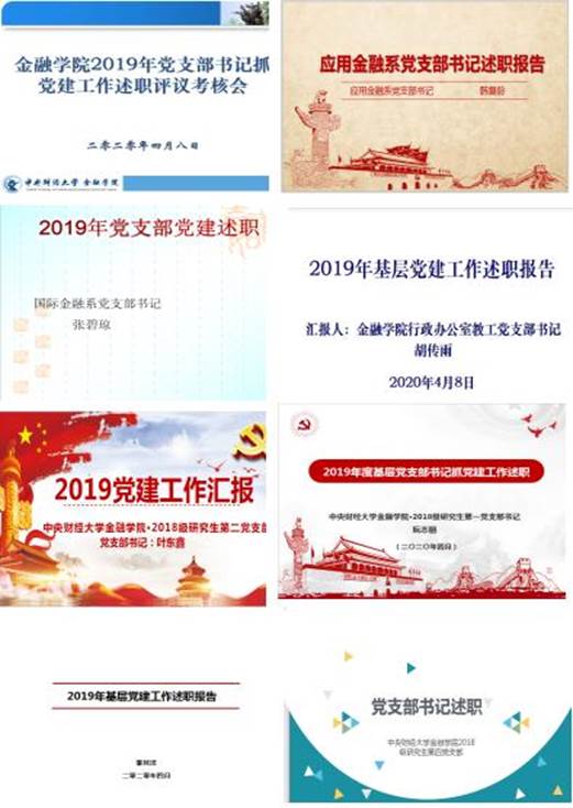 接下来,应用金融系教工党支部书记韩复龄、国际金融系教工党支部书记张碧琼、行政办公室教工党支部书记胡传雨和4位员工党支部书记以视频形式进行了述职,从学习贯彻习近平新时代中国特色社会主义思想和党的十九大、十九届四中全会精神;严格落实公司党委交办的各项工作任务情况;上学期开展的“不忘初心、牢记使命”主题教育的措施成效;党支部书记的工作职责和履职能力;疫情防控工作中的党员作用发挥;下一步工作思路及打算等方面进行了汇报。