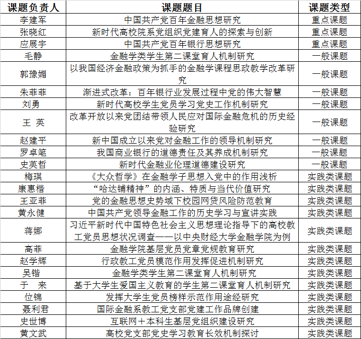 为迎庆中国共产党成立100周年,深入扎实开展党史学习教育,公司组织了庆祝建党100周年专项课题申报与评审工作,推动全院师生深刻阐释中国共产党领导下的金融思想和金融实践伟大成就,系统研究中国共产党领导下的金融教育事业发展,深入探索党建育人创新模式,为建党100周年献礼。经公司师生申报、院内外专家组评审和公司党委讨论通过,拟对24个课题予以立项,现将拟立项名单予以公示。