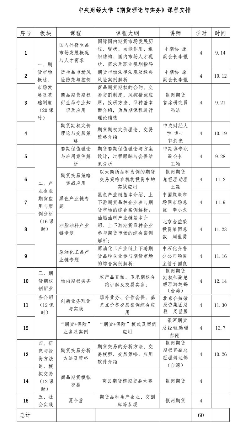 第三期“期货人才培育工程”项目已开班,项目持续至2019年12月,上课时间:周六上午9-12点,地点:沙河主教217, 课程专题见附表。欢迎感兴趣的师生参与旁听交流!