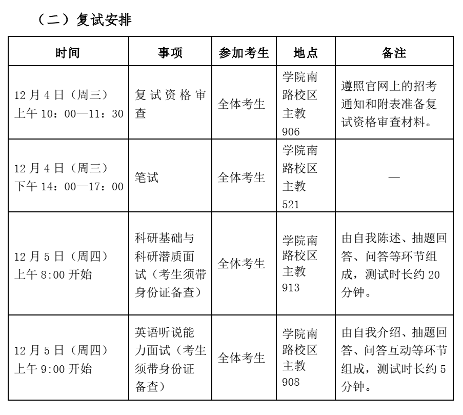 复试由笔试和面试两部分构成,笔试、面试满分都是100分。面试成绩中,科研基础与科研潜质占90%,英语占10%。复试总成绩按百分制计,复试总成绩=笔试成绩(满分100)×40%+面试成绩(满分100)×60%。